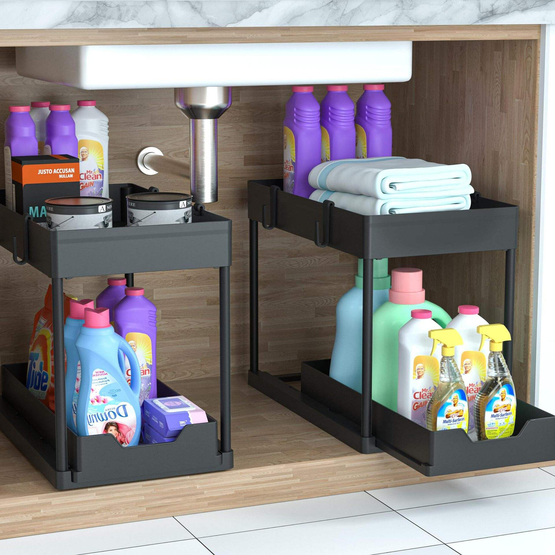 The sliding lower basket is designed for quick and easy access to items stored deeper inside. No more bending or reaching awkwardly under the sink to grab what you need. Everything glides out smoothly, saving time and making your routine more convenient.