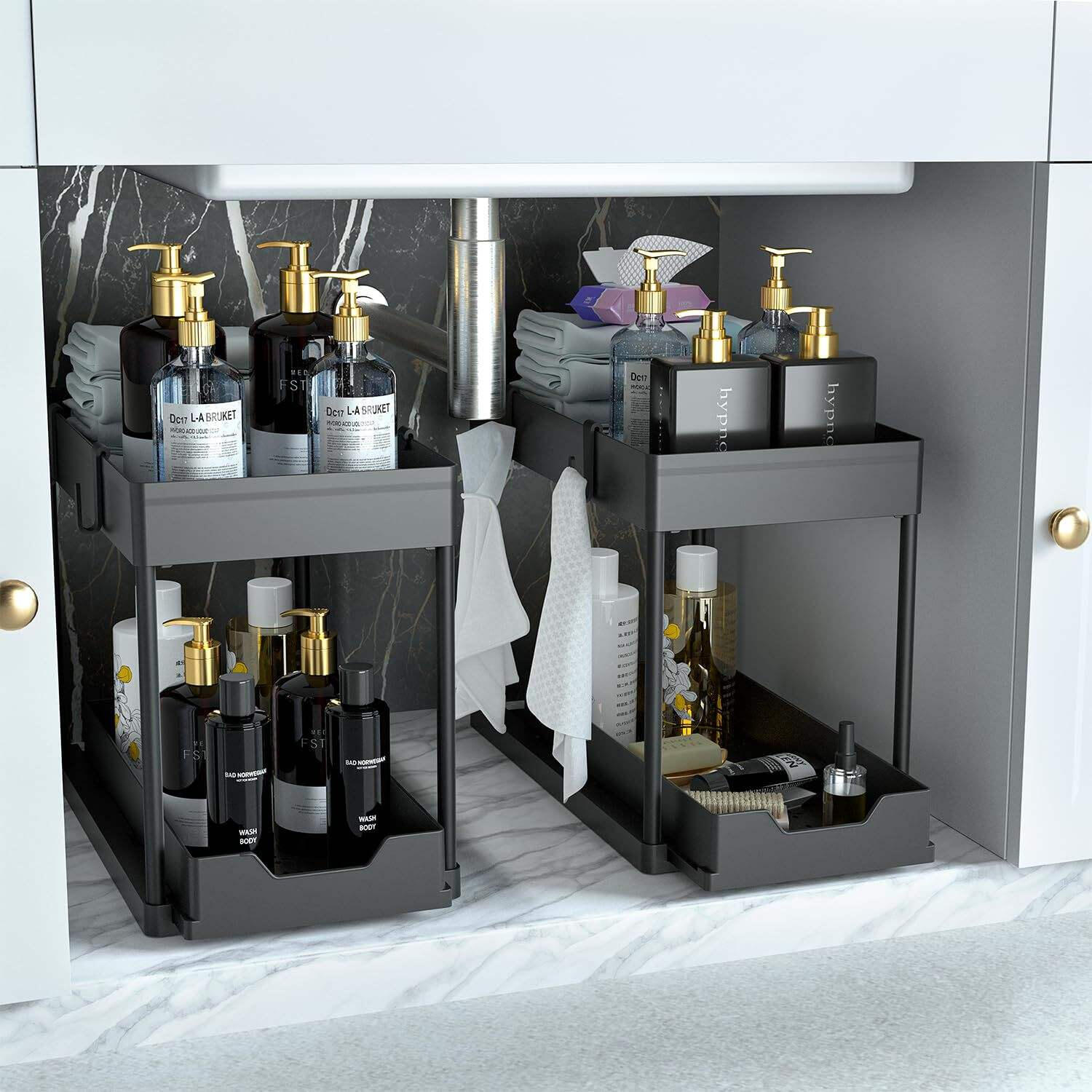 The two-tier layout maximizes vertical space, giving you more storage without taking up extra room. It allows you to neatly separate daily essentials from less frequently used items. This thoughtful design helps keep your sink area visually clean and easy to manage at all times.
